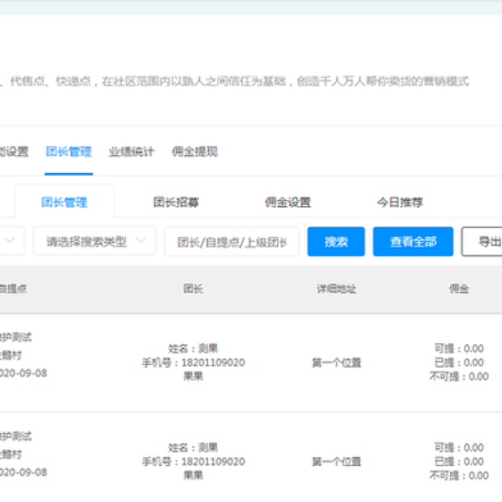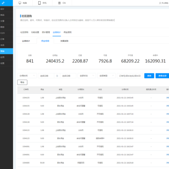 社区团购新增加了”佣金明细”和”发展奖励”两项列表,用于对团长获取分佣情况进行统计和查询.1.佣金明细佣金明细以”订单为单位”展示”团长佣金(下单时选择自提点获得佣金)”和”上级团长佣金(所选自提点的上级团长获得佣金)”两种类型的佣金.可根据分佣获得的时间或提现通过的时间进行筛选.其佣金分为四种状态已提现:已申请提现并审核通过的订单佣金.可提现:订单已完成且超出退换货周期后的订单佣金.(如有商品正在申请退货,则需退货处理完成后变为可提).不可提现:已获得佣金,但订单还未完成或在退换货期限内或订单内有商品正在申请的退