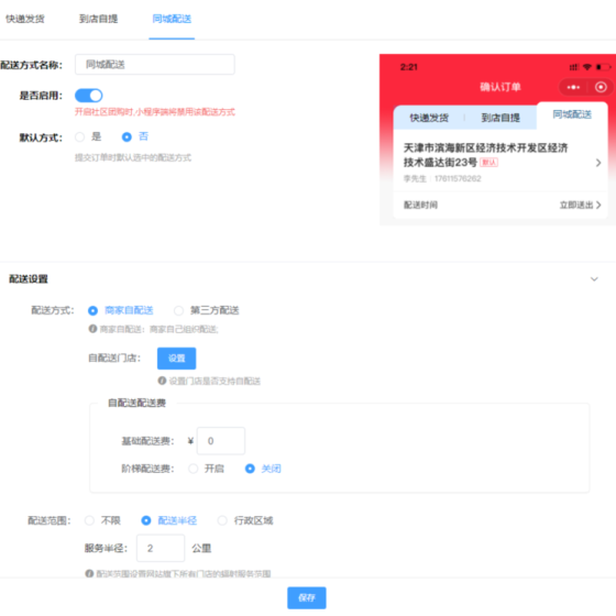 1、需求背景同城配送功能主要用于满足同城鲜花配送、同城生鲜、蛋糕等同城市短距离配送业务需求。当前仅支持手机端和小程序端当小程序端开启社区团购功能后,小程序端该功能将被禁用,手机端不受影响该功能需要配合门店或商铺功能才能使用,且门店或商铺必须完善相关信息,如地图坐标等。2、商家后台设置2.1、功能开启开启同城配送功能开关,前台买家提交订单时可以选择以同城配送的方式提交订单2.2、自定义同城配送名称自定义名称后,买家前台下单时看到的配送方式将展示为商家自定义的名称2.3、设置同城配送为默认配送方式设置为默认方式