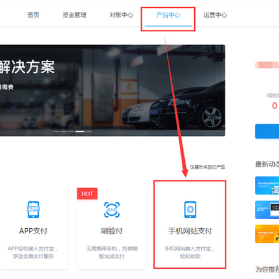 一、申请支付宝电脑支付1.需要有企业支付宝账号申请支付宝“手机网站支付”功能,需要先有一个企业支付宝账号,如果没有需要先进行申请企业支付宝账号,申请地址为:https://memberprod.alipay.com/account/reg/enterpriseIndex.htm注意:申请账号时,请按要求进行实名认证,企业账号银行打款认证时间为:2天(中国邮储2个工作日),证件认证2天。2.申请“手机网站支付”功能手机网站要使用支付宝支付功能,需要申请支付宝“手机网站支付”端口登录支付宝后台—产品中心—手机网站支付,位置如图1:注意:申请“手机网站支付”功能准备条件