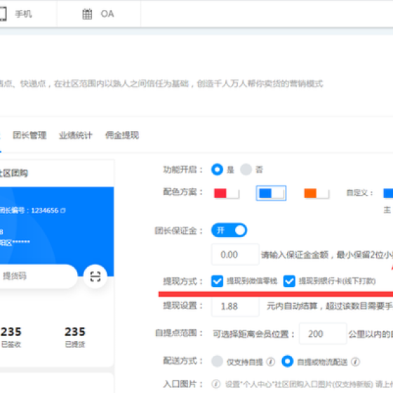 1.设置社区团购新增加了”提现到银行卡(线下打款)”的提现方式,可在后台开启设置(需要升级新版小程序).设置开启后,团长在提现佣金时可选择已添加的银行卡来提交提现申请.所提交的申请由后台管理员进行审核核销.(该方式进对佣金进行核销,佣金需线下完成打款)2.选择银行卡提现团长在前台进行提现时,可选择后台设置允许的提现方式进行提现(微信零钱为线上付款到微信零钱;银行卡为线上提交申请核销,线下完成打款)此处选择的银行卡和会员信息中的银行卡信息同步.3.提现处理选择银行卡方式的提现,必须由后台进行审核核销.在后台的团长提现记录中