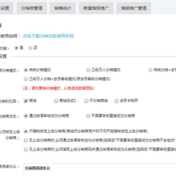 一、如何开启分销功能上线后,通过在后开开启”三级分销”功能,即可在前台展示我的分销的入口.后台多种分销功能自由配置,可根据需求设置自己需要的分销模式,推广模式,提现规则,分销商等级制度等.并可全面自定义重命名前台分销页面的展示文字