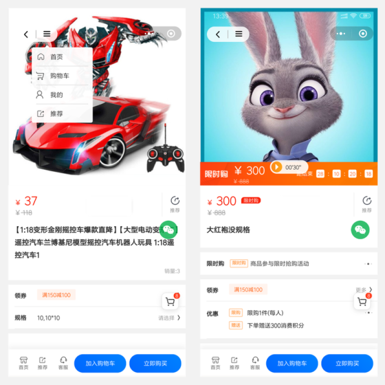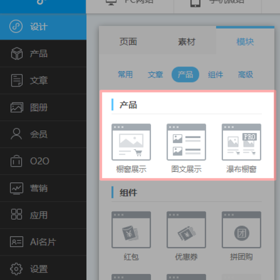 小程序产品橱窗展示、图文展示模块升级,新增瀑布橱窗模块功能位置:1、产品橱窗模块购物车按钮升级优化(1)商城版本默认显示购物车,购物车样式的颜色是根据小程序的色系设置,也可以设置隐藏或者自定义购物车图片。(2)商城版本系统调用商品栏目内容时购物车按钮普通商品点击购物车为购物弹窗;特殊商品进入商品详情页。(3)商城版本手工添加时,点击购物车按钮进入链接地址。(4)小程序展示版本默认不显示购物车按钮和购物车按钮样式设置。2、产品图文展示模块样式优化(1)购物车规则同“橱窗模块”一致。(2)优化了整个模块的默认样式①商品